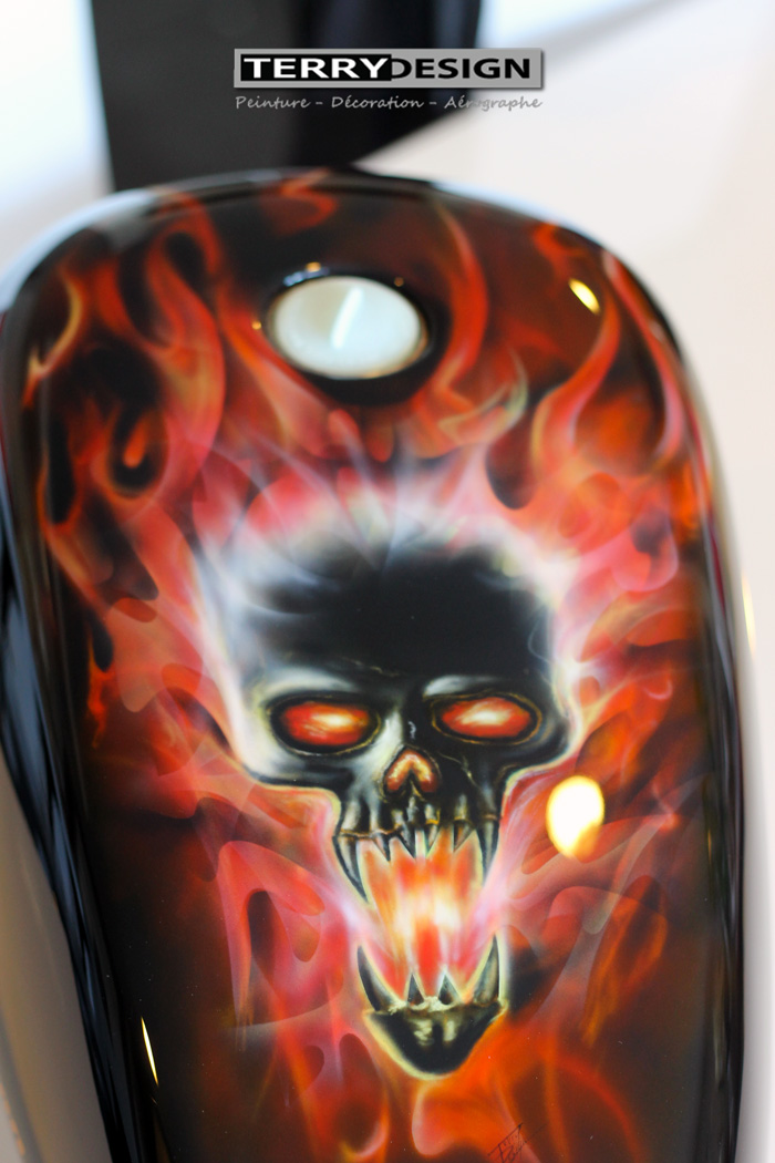 Décoration à l'aérographe sur réservoir de moto